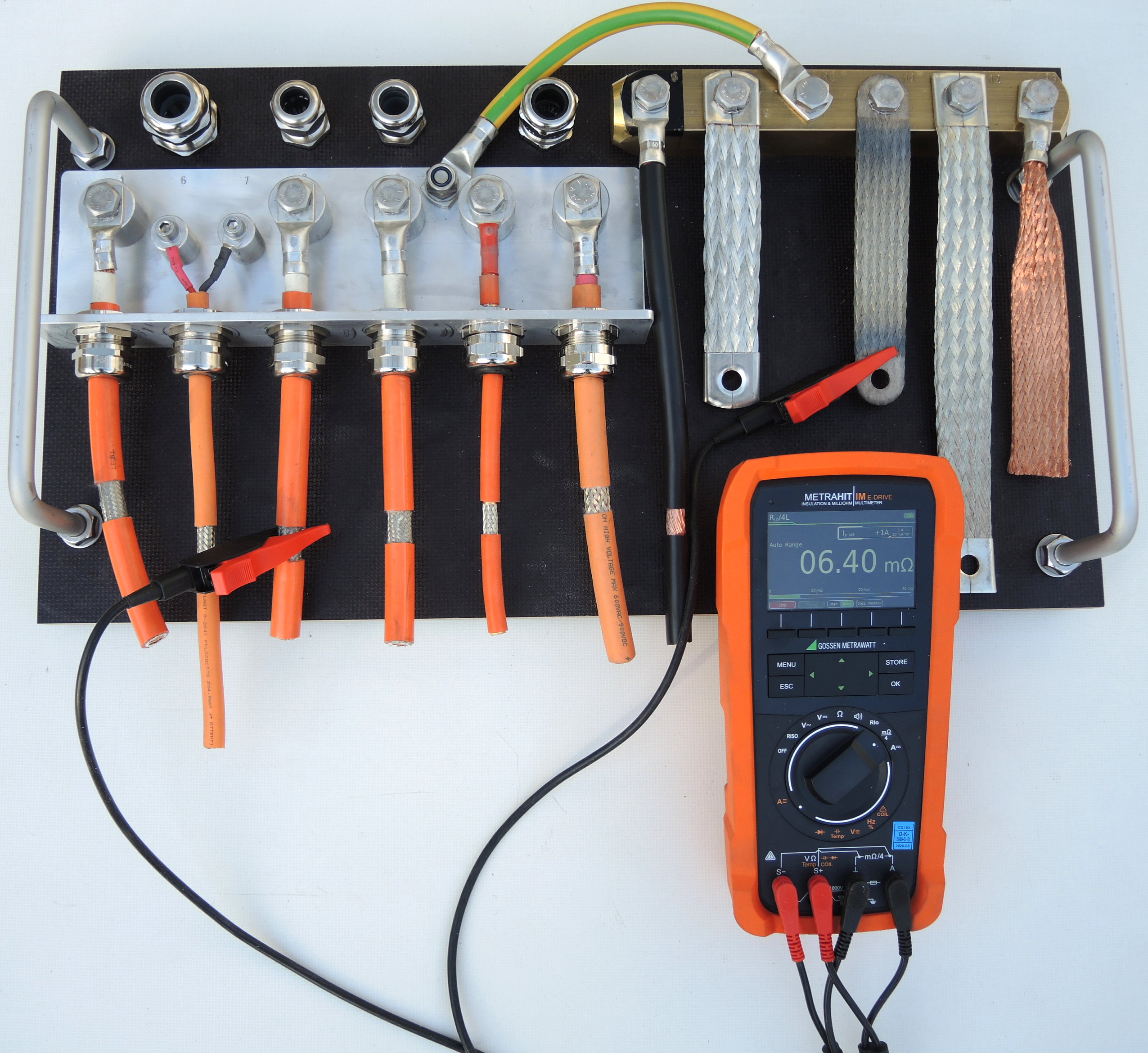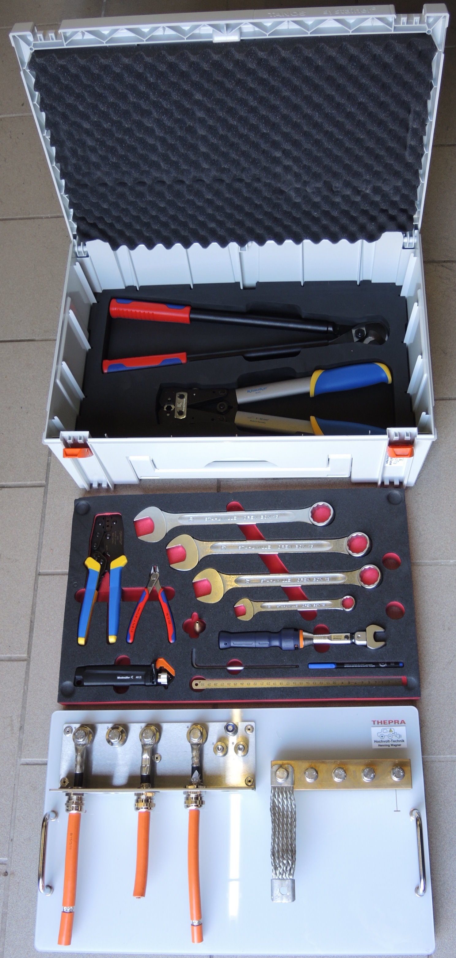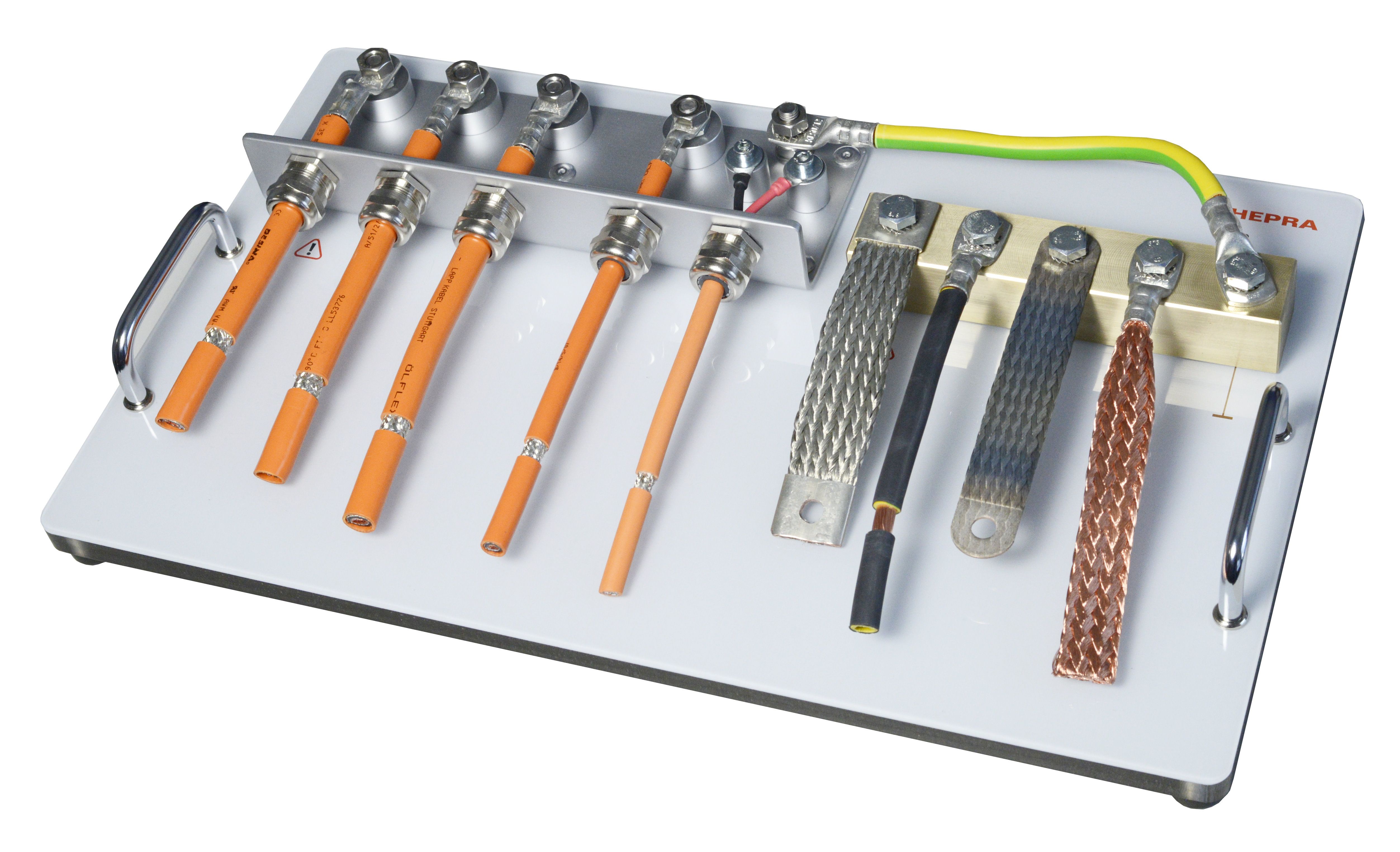 Entwicklung eines Übungsbrettes zur Herstellung / Crimpen von HV-Leitungen mit Anschlagen von EMV-Verschraubungen. Die Qualität der Verbindung der Abschirmung zum HV-Gehäuse kann mit dem Milliohmmeter überprüft werden. Links sieht man den Prototyp. Die beiden rechten Bilder sind die Profi-Umsetzung durch die Lehrmittel-Firma THEPRA Didactic GmbH. Die Versuchsplatte wird in einem Koffer geliefert, der auch das entsprechende Werkzeug in Einlegeböden beherbergt. Ebenfalls gibt es einen Koffer mit dem Verbrauchs-Material wie HV-Kabel, Kabelschuhe und unterschiedlichste Verschraubungen. Dazu gehört auch eine detaillierte Versuchsanleitung mit Hintergrundwissen.